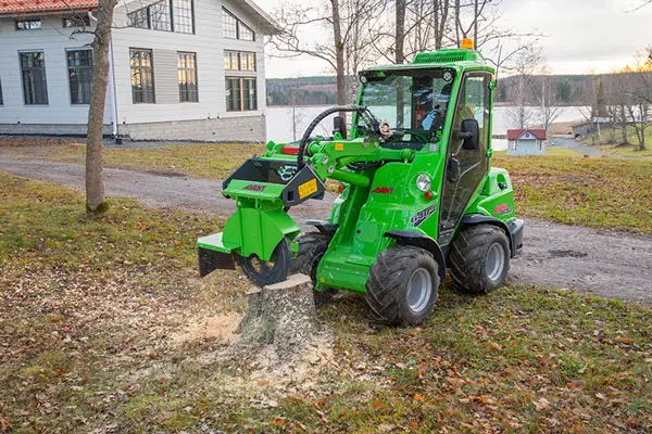 Avant stump grinder is an efficient and easy to operate tree stump remover. The cutting disc is mounted crosswise in relation to the loader, which means it throws the wood waste to the right side the waste doesn’t fly on the operator or the loader. In addition, the stump grinder is equipped with a protective rubber cover which prevents the wood from flying around.