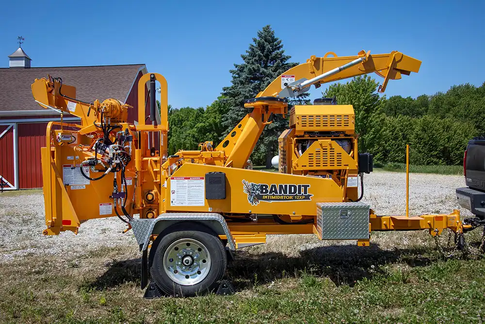 Companies seeking a highly productive, compact drum-style chipper turn to the Intimidator 12XP. Featuring a 24-inch diameter drum with a large 13-inch by 17-inch throat opening, it easily process large brush stacks and limbs. Powerful dual feed wheels mounted in Bandit’s proven Slide Box Feed System provide direct down pressure to material entering the chipper, requiring little-to-no trim work on material before feeding it through the chipper.