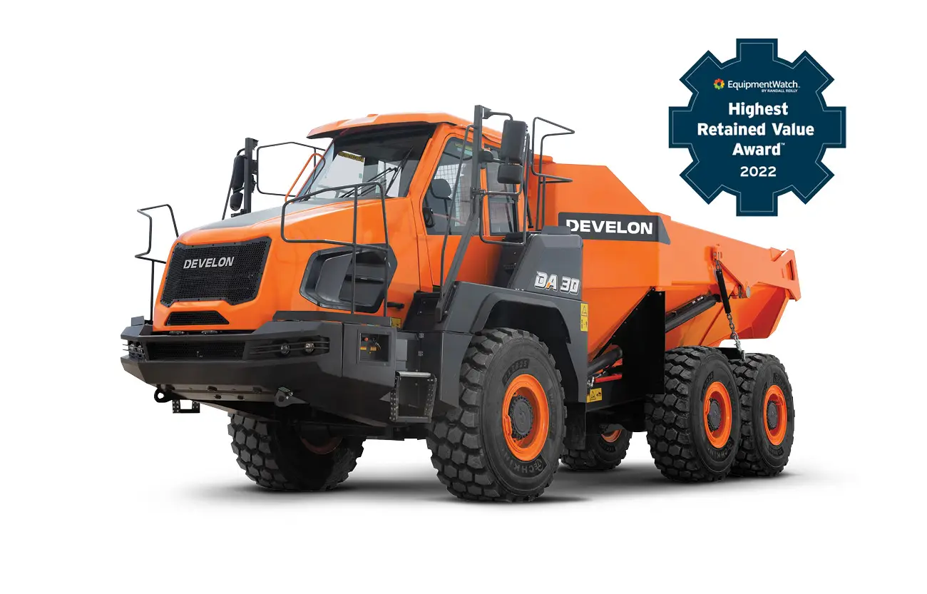 The Develon DA30-5 Articulated Dump Truck has a class-leading power-to-weight ratio. Limited-slip differentials on each axle deliver excellent traction, and a sloping rear frame provides a low center of gravity providing lateral stability.