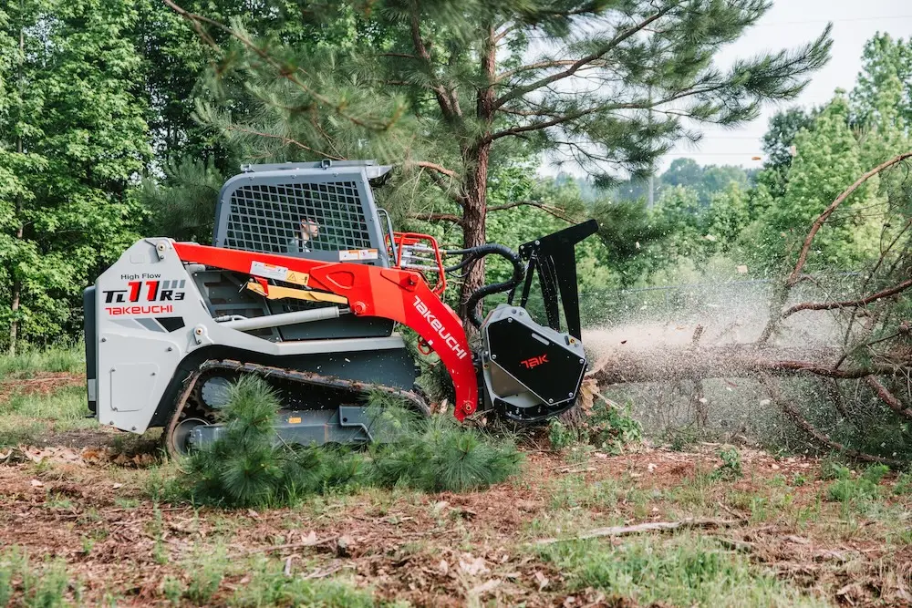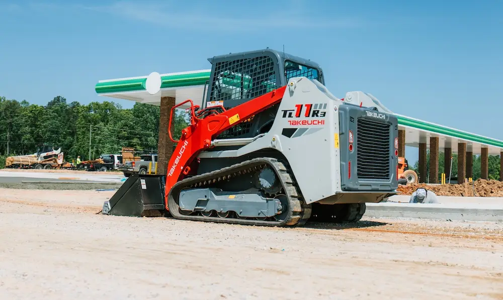 Takeuchi’s TL11R3 Compact Track Loader has an operating weight of 11,650 lbs and a 107.3-horsepower engine, making it a versatile and well-balanced machine that excels in a wide range of applications. Its radial lift boom design is engineered to deliver superior breakout forces, making the TL11R3 particularly well-suited for grading and dirt work. The TL11R3’s operator station features an intuitive 8-inch touchscreen multi-information display that integrates Bluetooth radio and air conditioning controls within the screen. It also includes a standard rearview camera, electric-over-hydraulic (EH) joystick controls, an adjustable suspension seat, and a large cup holder—all designed to keep operators informed, comfortable, and less fatigued. EH controls ensure smooth operation for both travel and loader functions while enabling a range of new features that optimize productivity. Additionally, a heavy-duty rear door and a tilt-up cab provide exceptional access to the TL11R3’s engine and routine inspection points.
